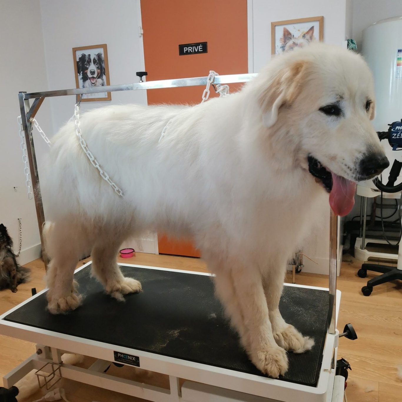 Tout le corps a les poils rasés à la même longueur. Bain brush compris.Finition aux ciseaux.